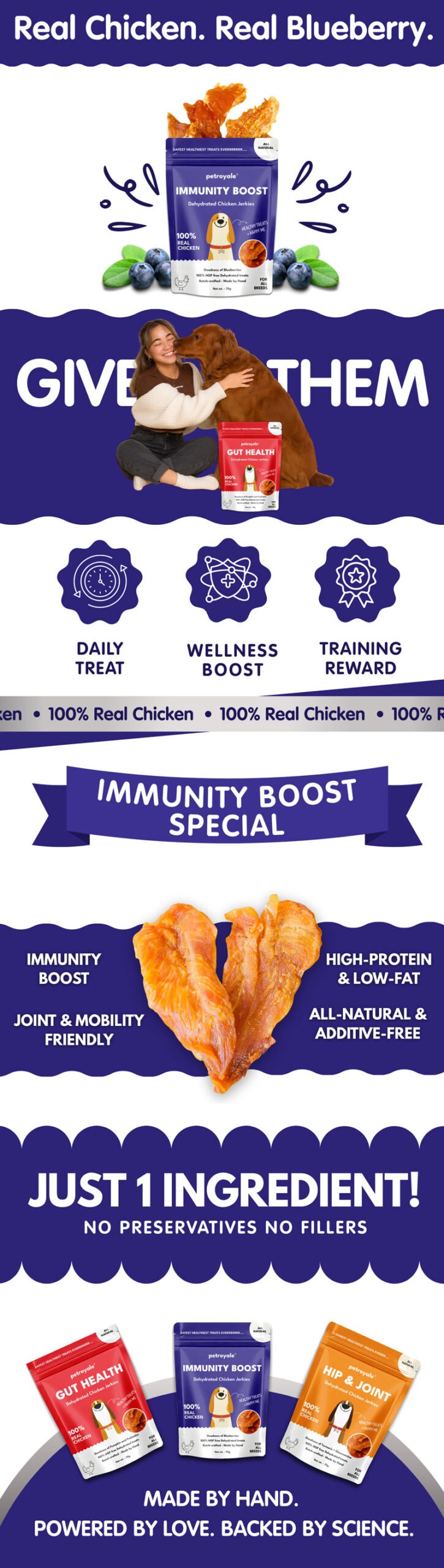 Support your dog’s immune system with a treat that’s as functional as it is flavourful. Petroyale’s Immunity Boost Jerky is packed with real chicken, antioxidant-rich blueberries, and prebiotics that work together to protect your pet from everyday infections and keep their system strong and balanced.