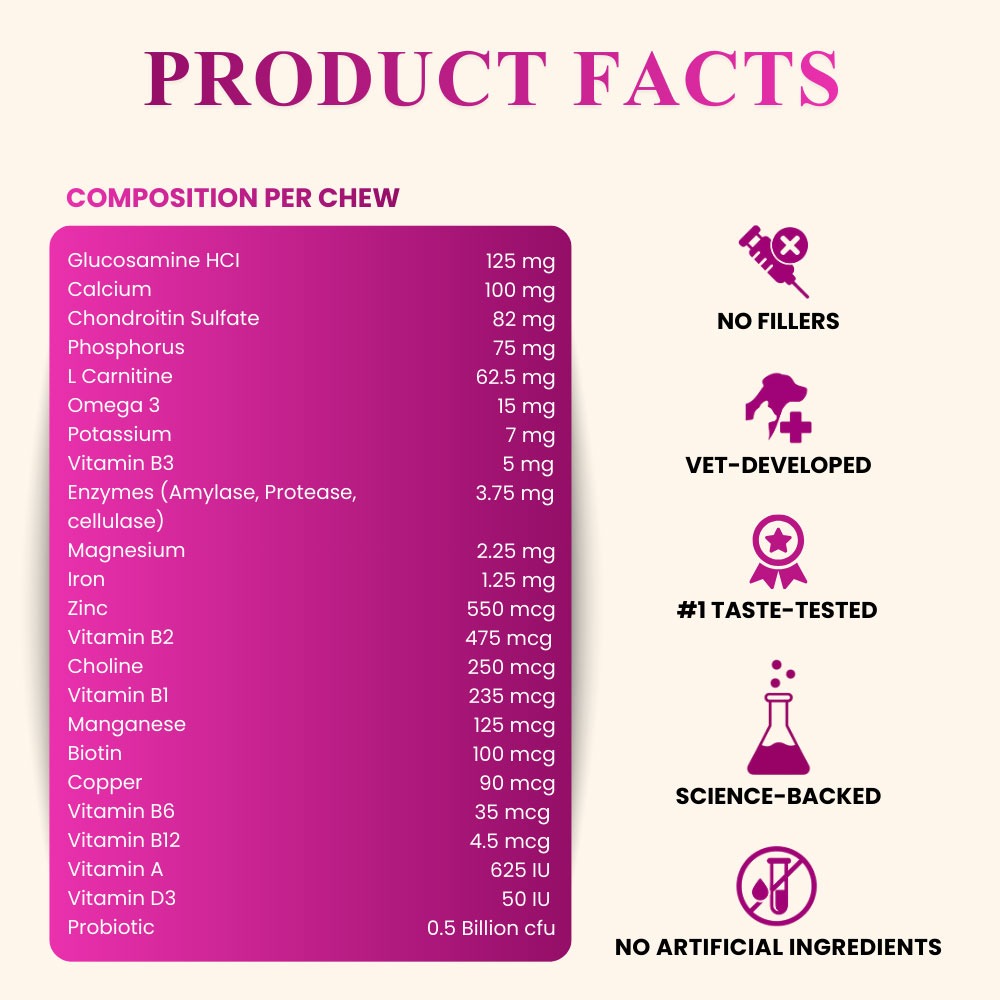 - Delicious Soft Chews — Highly palatable and easy to give — perfect for training or daily supplementation.