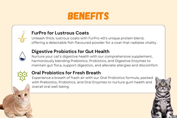 FurPro for Lustrous Coats: Unveil thick, lustrous coats with FurPro-40's unique protein blend. Delight your cat with a delectable fish-flavoured powder that results in a coat that exudes vibrancy.